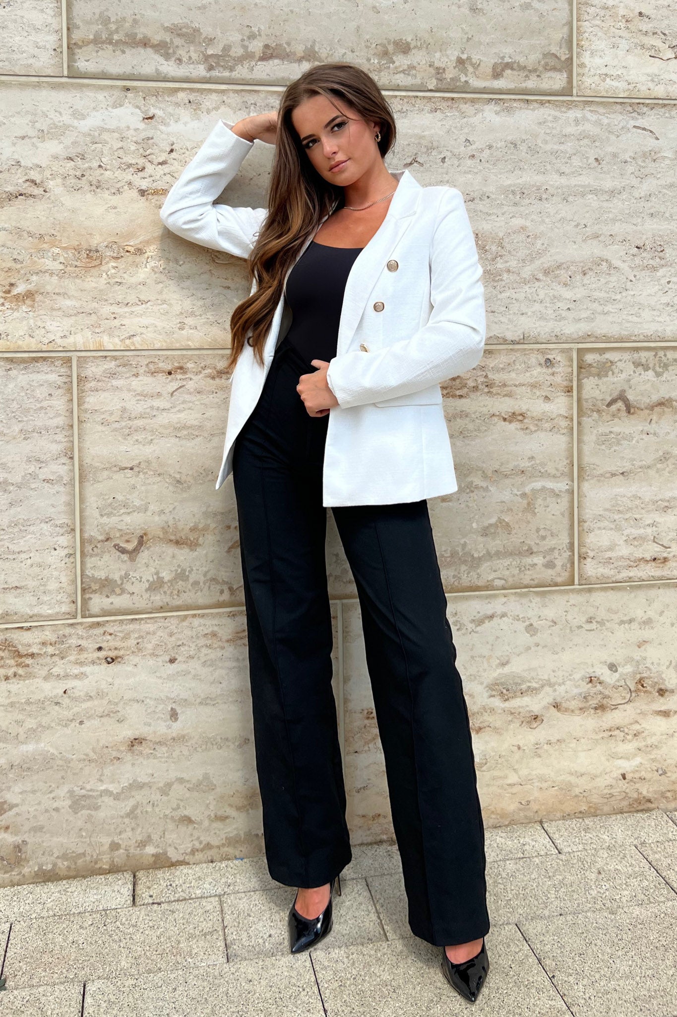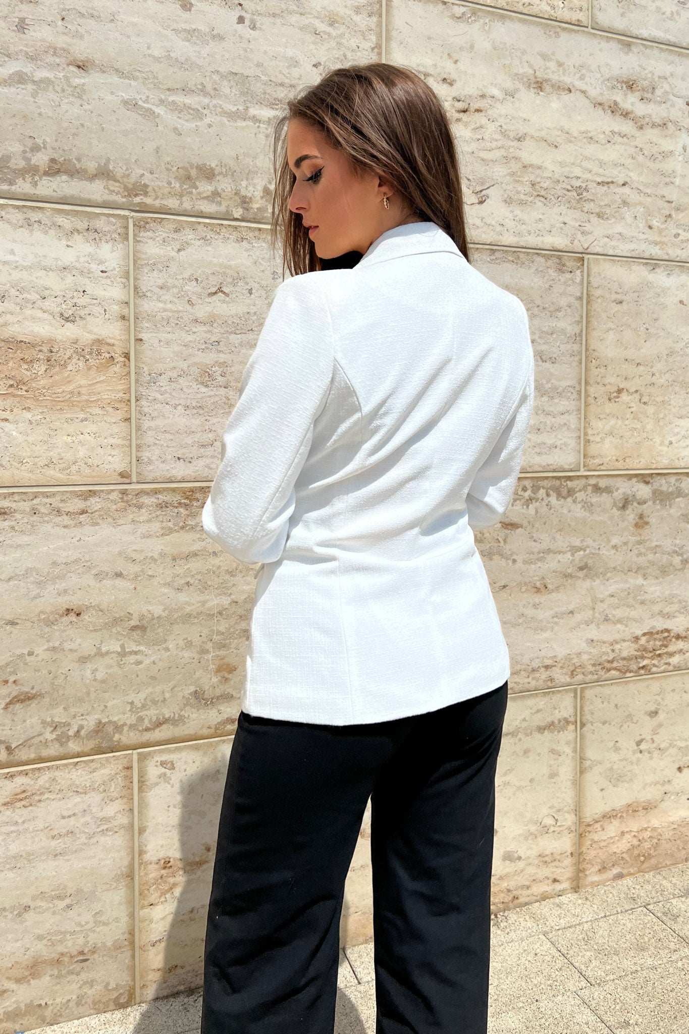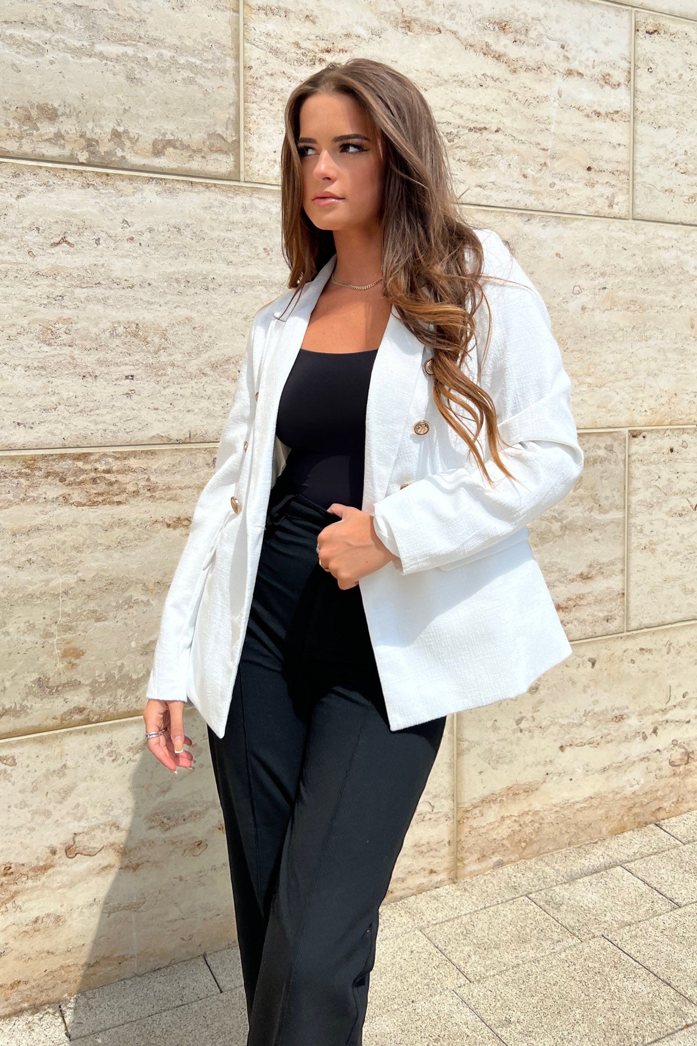 Add an elegant touch to any look with this stunning White Button Detail Blazer . Featuring shoulder pads, gold buttons and a tailored fit for a flattering look. Pair with jeans and heels to achieve a sophisticated look.