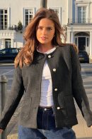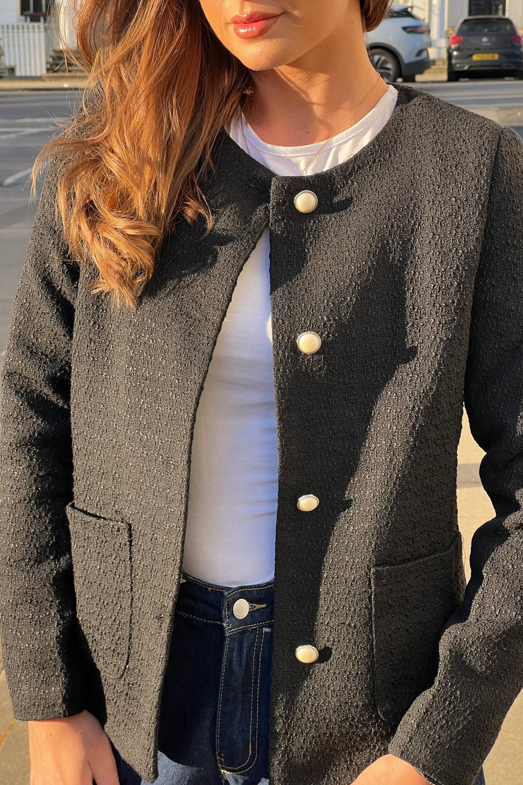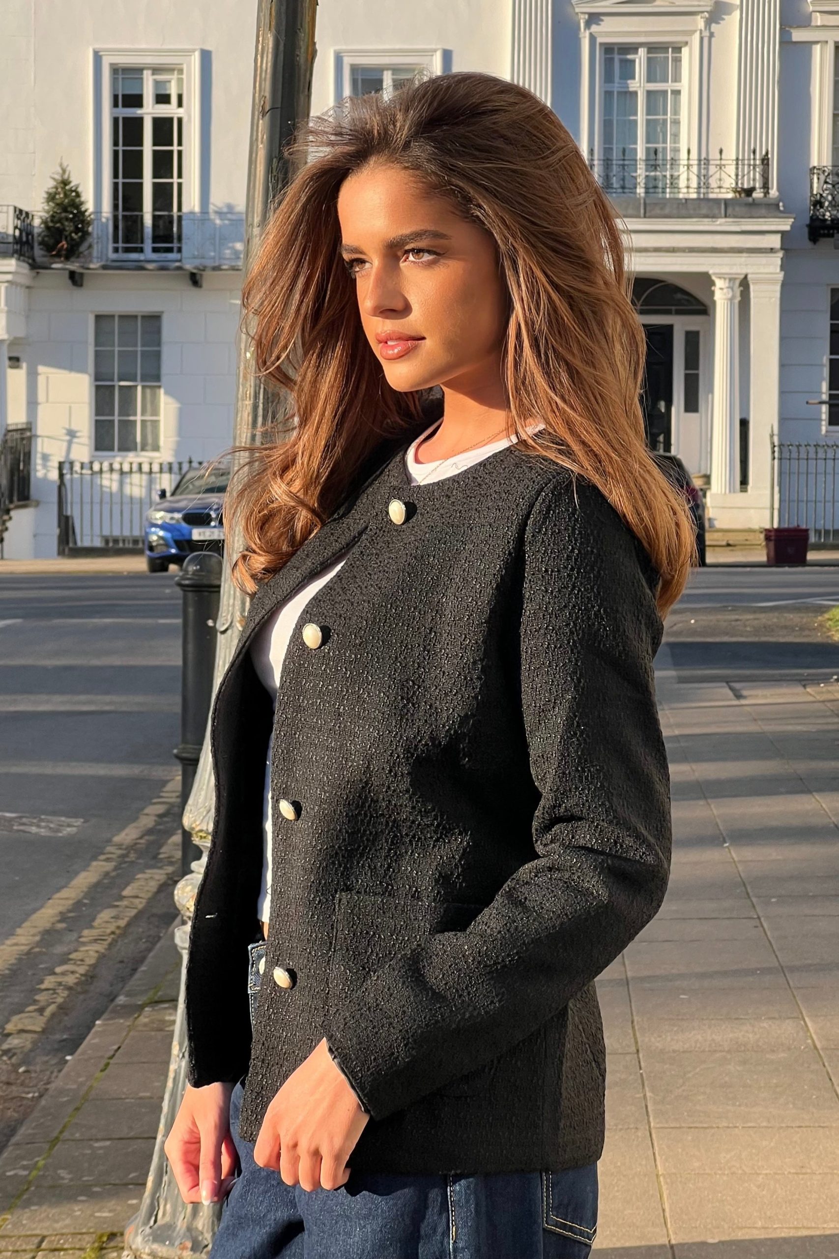 Introducing the Florence Blazer: a graceful interpretation of classic sophistication, crafted with fine textured fabric and finished with luxurious white buttons. Featuring an exquisite cut that contours to the feminine silhouette, this timeless piece is perfect for a refined evening look.